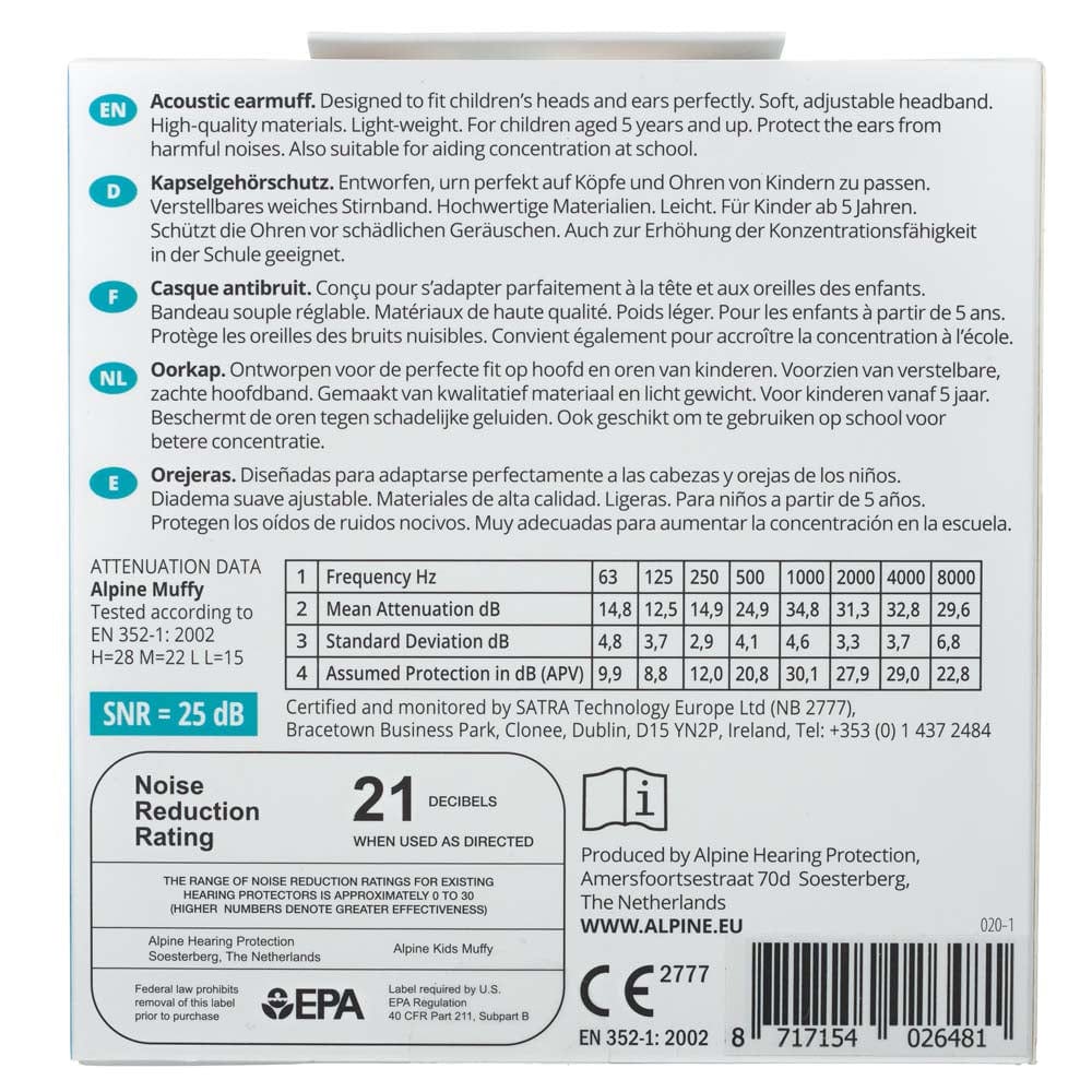 Alpine Muffy Kids is ontworpen om het extra gevoelige gehoor van kinderen van 5 tot 16 jaar te beschermen tegen schadelijk geluid. De oorkappen kunnen worden gebruikt in lawaaierige omgevingen, zoals feesten, optochten, vuurwerkshows, concerten en auto- en motorraces. De kleine oorkappen voor kinderen zorgen ook voor geluidsreductie, waardoor de concentratie wordt verbeterd, bijvoorbeeld in lawaaierige klaslokalen. De hoofdband is verstelbaar en voorzien van een zachte voering. Alpine Muffy Kids oorkappen zijn verkrijgbaar in vijf nieuwe, trendy kleuren. De buitenlaag van de kleurrijke oorkappen is gemaakt van kunststof en daardoor gemakkelijk schoon te maken. De oorkappen kunnen worden opgevouwen, zodat ze gemakkelijk mee te nemen zijn. Geef uw kind een comfortabel en veilig gevoel.