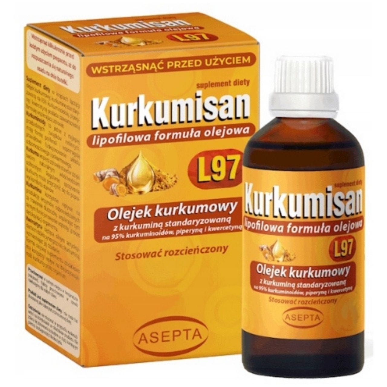 Asepta Kurkumisan Kurkuma-olie is een voedingssupplement in de vorm van druppels . Het bevat olie uit kurkuma-wortelstokken ( Curcuma longa ) , kurkuma-extract gestandaardiseerd tot 95% curcuminoïden , zwarte peperextract gestandaardiseerd tot 95% piperine , quercetine en mangaan in extra vierge olijfolie. De formule is verrijkt met rozenbottelolie. Dagelijkse dosis: 5 druppels 2-3 keer per dag . Bevat geen: gluten , lactose , GGO's , kunstmatige kleurstoffen.