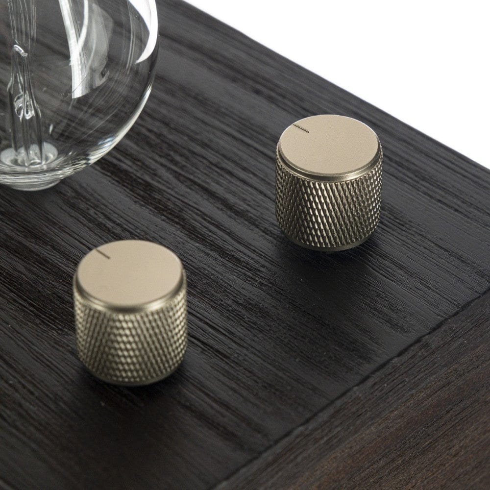 - Een basis van dennenhout, glazen fles , bol en metalen knoppen – duurzaamheid en elegantie in één.