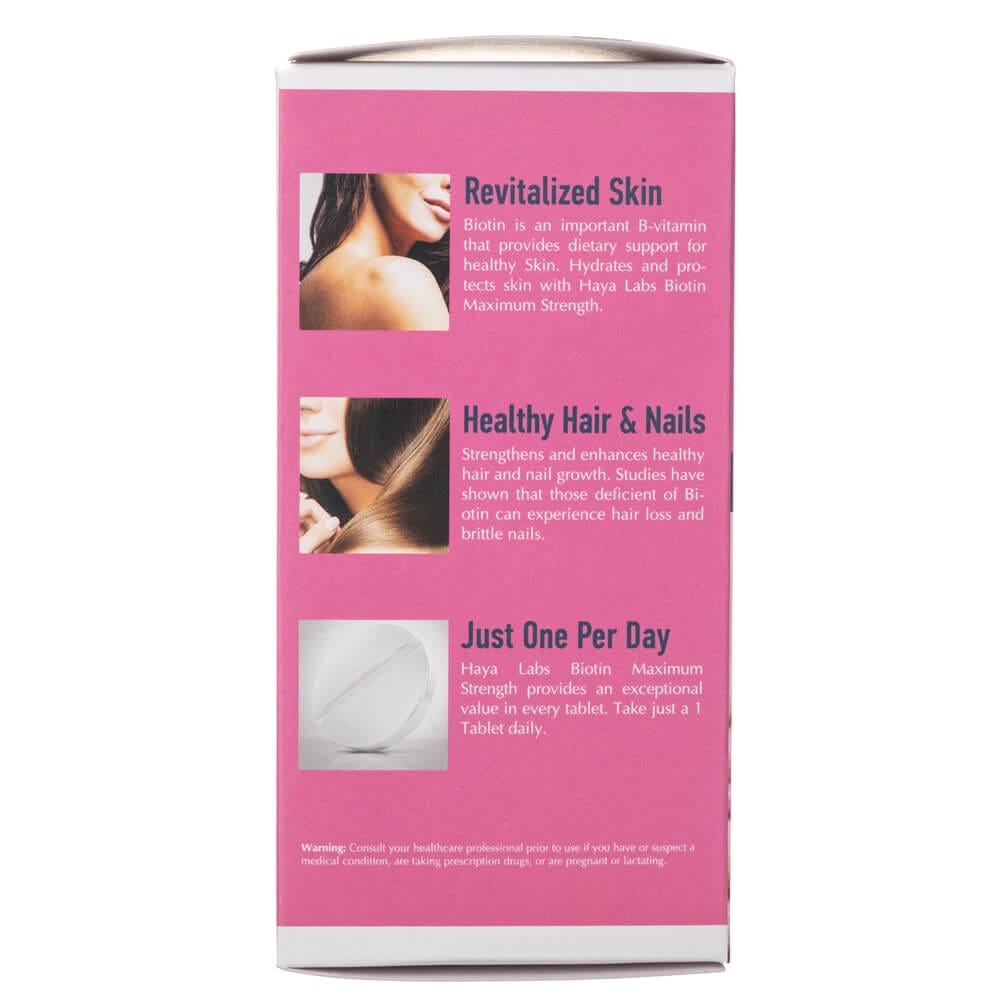 Biotin Maximum Strength van Haya Labs is een voedingssupplement in tabletten met een hoge dosis biotine.