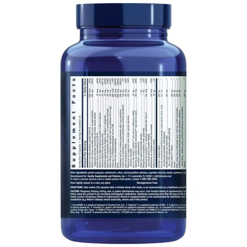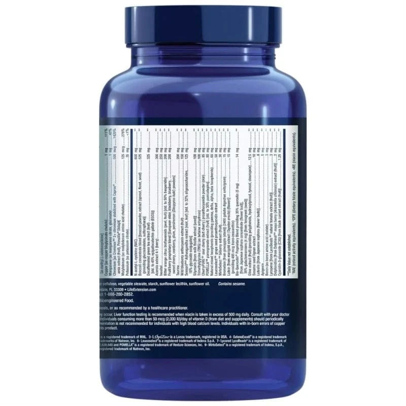 Vitamine A (als beta-caroteen, acetaat) (5000 IU), Vitamine C (als calcium ascorbaat, ascorbinezuur, ascorbyl palmitaat, magnesiumascorbaat, niacinamide-ascorbaat, acerola-extract), Vitamine D3 (als cholecalciferol) (2000 IE.), Vitamine E (als D-alfa tocoferylsuccinaat, D-alfa tocoferol), Thiamine (vitamine B1) (als thiamine hydrochloride), Riboflavine (vitamine B2) (als riboflavine, Riboflavine 5'-fosfaat), Vitamine B6 [als pyridoxal 5'-fosfaat (100 mg), pyridoxine HCI (5 mg) ], Folaat (als calciumzout van L-5-methyltetrahydrofolaat), Vitamine B12 (als methylcobalamine), Biotine, Pantotheenzuur (als calcium D-pantothenaat met 5 mg pantethine), Calcium (als calciumascorbaat, calcium D-pantothenaat, dicalciumfosfaat), Jodium (als kaliumjodide), Magnesium (als magnesiumoxide, citraat, arginaat, glycinaat, tauraat, ascorbaat), Zink (als zinkcitraat, L-OptiZinc ® 3 zinkmono-L-methioninesulfaat), Selenium [als natriumseleniet, SelenoExcell ® 4 seleniumrijke gist, Se-methyl-L-selenocysteïne], Koper [als koperbisglycinaat-chelaat], Mangaan (als mangaancitraat, mangaangluconaat), Chroom [als Crominex ® 5 3+ chroom gestabiliseerd met Capros ® amla-extract (fruit), PrimaVie ® Shilajit], Molybdeen (als molybdeen aminozuur chelaat), Kalium (als kaliumcitraat), Broccoli concentraat mix [broccoli poeder, extract (kiemen, bloeiwijzen, zaden) (die glucosinolaten, sulforafaan) ], N-acetyl-L-cysteïne (NAC), cafeïnevrij extract van groene thee (blad) [std. tot 45% epigallocatechine gallaat (EGCG) ], Acerola extract 4:1 (bessen), Inositol, Citrus bioflavonoïden van bittere sinaasappel (schil, fruit) [std. tot 50% hesperidine], Eigen fruit- en bessenmengsel [vlierbes, braam, bosbes, kers, veenbes, pruim, kaki (Diospyros kaki) poeder], Taurine, Wilde bosbes anthocyaan extract (fruit), Sensoril ® 10 Ashwagandha extract (wortel, blad) [std. tot 32% oligosachariden,10% glycosideconjugaten], Silymarin [van mariadistelextract (zaad) ], Trimethylglycine (TMG) (als watervrij betaïne), CherryPure ® 1 proanthocyanidine-extract (schil), POMELLA ® 8 Granaatappelextract (fruit) [std. tot 30% punicalagines], Natuurlijke gemengde tocoferolen (die gamma, delta, alfa, bèta tocoferolen), MirtoSelect ® 9 bosbessenextract (fruit), Leucoselect ® 6 proanthocyanidine-extract van druivenpitten, Bio-ethyleen ®Quercetine ® Eigen mengsel dat 35% quercetine (5 mg) [uit Japanse sophora concentraat (bloemknop) ],30% galactomannanen (4 mg) [uit fenegriek (zaad) ] 15 mg, Bromelaïne [van ananas (stengel) ] (2400 gelatine verteerbare eenheden/gram), Luteïne [van goudsbloemextract (bloem) ] (die 465 mcg trans-zeaxanthine), Olijf extract (fruit) (dat polyfenolen, hydroxytyrosol, tyrosol, oleuropein), Sesamzaad lignan extract, Luteoline [van Japanse sofora (bloemknoppen) ], Apigenine, Boron (als aminozuurchelaat van boor), Lycopeen [van LycoBeads ® 7 natuurlijk tomatenextract (fruit) ], Delphinidin [van Delphinol ® 2 extract van maquibessen (Aristotelia chilensis) (fruit) ], Cyanidine 3-glucoside (C3G) [van zwarte bessenextract (fruit) ], Gelatine (capsule), Vulstoffen: maltodextrine, siliciumdioxide, microkristallijne cellulose, plantaardig stearaat, zetmeel, zonnebloemlecithine, zonnebloemolie.