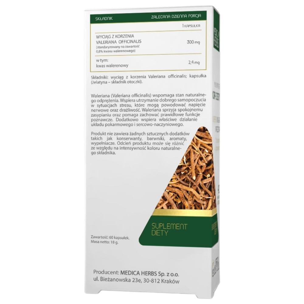 Een voedingssupplement in capsules van Medica Herbs. Het preparaat bevat 300 mg valeriaanextract (Valeriana Officinalis) , gestandaardiseerd tot valeriaanzuur.