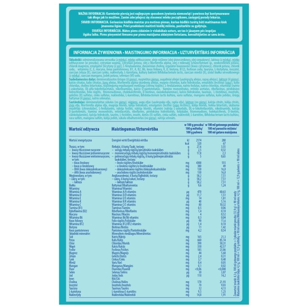Gedemineraliseerde wei (uit melk), Magere melk, Plantaardige oliën (Zonnebloemolie, Koolzaadolie), Lactose (uit melk), calciumcitraat, kaliumcitraat, visolie, Mortierella Alpi na-olie, magnesiumchloride, kaliumhydroxide, emulgator (lecithinen (uit soja)), kaliumchloride, cholinebitartraat, zuurteregelaar (citroenzuur), L-fenylalanine, natriumfosfaat, natriumchloride, vitaminen (C, E, niacine, pantotheenzuur, B1, A, B2, B6, foliumzuur, K, D, biotine, B12), calciumhydroxide, taurine, L-histidine, inositol, ijzer (II) sulfaat, zinksulfaat, nucleotiden, L-carnitine, Bifidobacterium lactis bacterieculturen, koper (II) sulfaat, mangaansulfaat, kaliumjodide, wei-eiwit (uit melk), natriumselenaat (VI).