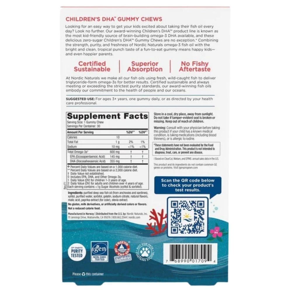 Nordic Naturals Children's DHA is een voedingssupplement in de vorm van heerlijke gummies met tropische fruitsmaak. Speciaal samengesteld voor kinderen vanaf 3 jaar. Bevat omega-3-vetzuren (DHA + EPA) zonder toegevoegde suikers. Het product levert 600 mg omega-3-vetzuren per portie.
