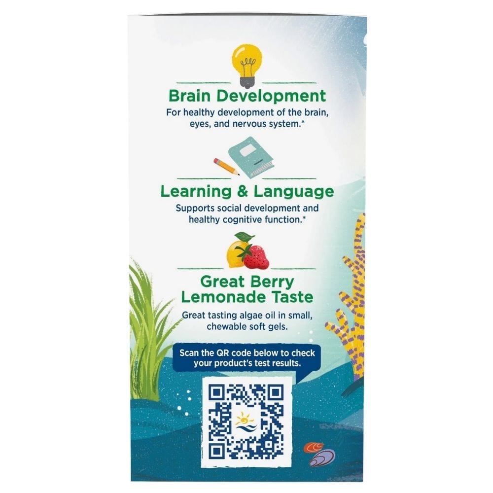 It contains Omega-3 DHA from microalgae, which supports child development and immune system health. It provides 375 mg of DHA per serving.