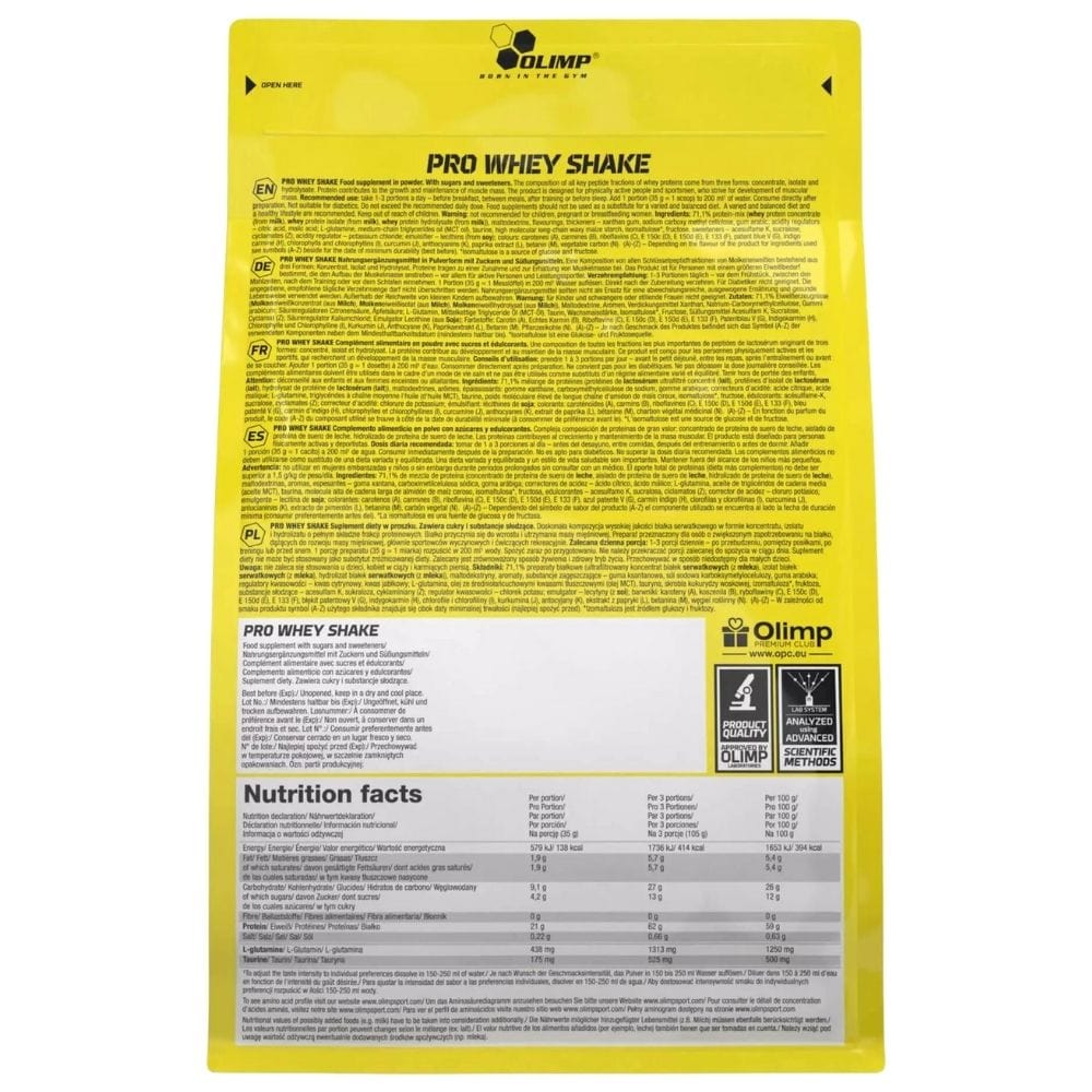 Olimp Pro Whey Shake is een voedingssupplement in poedervorm. Een eiwitsupplement voor mensen met een verhoogde eiwitbehoefte die spiermassa willen opbouwen, voornamelijk wedstrijdsporters en recreatieve sporters. Het combineert drie eiwitbronnen: weihydrolysaat, isolaat en concentraat.