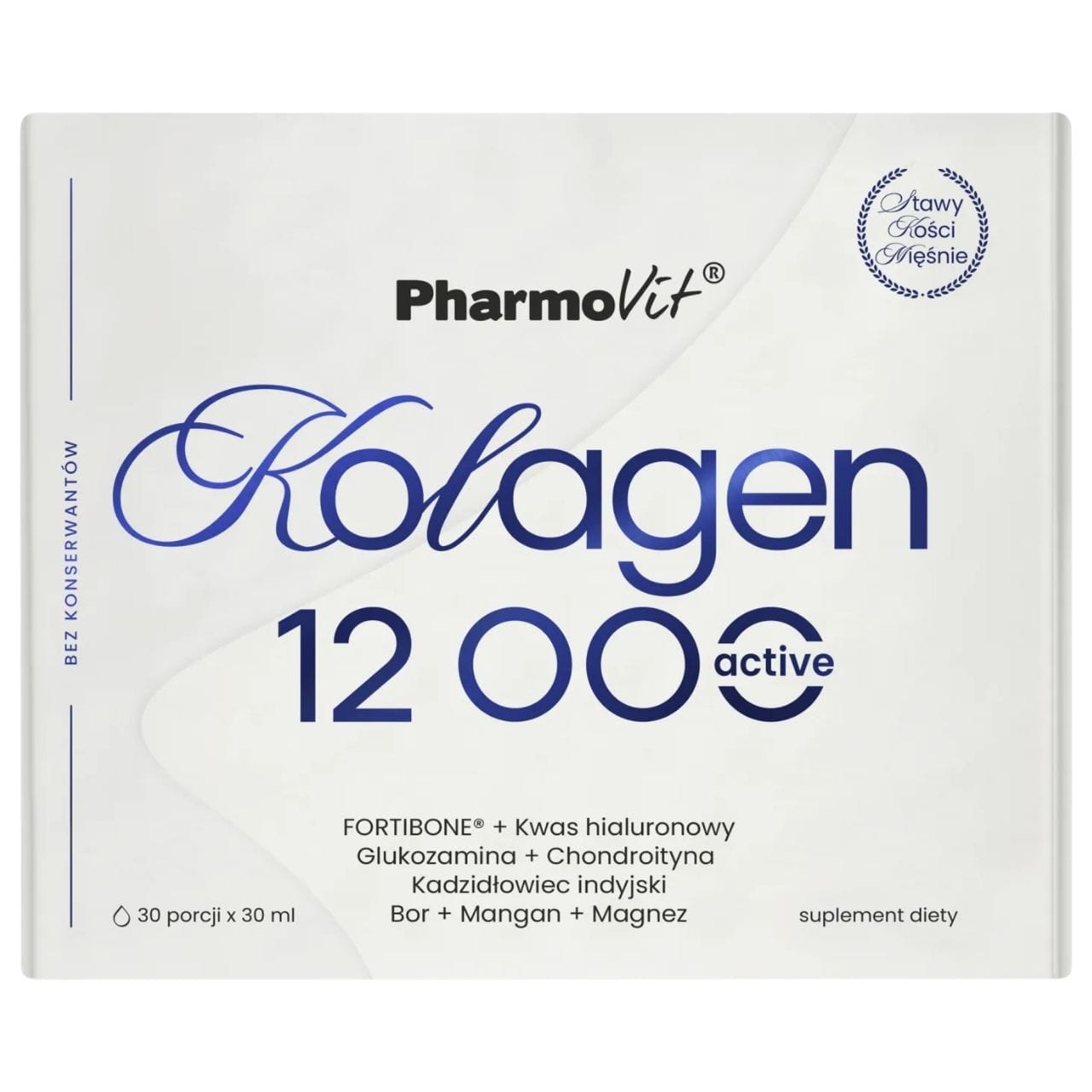 Pharmovit Collagen 12000 Active is een voedingssupplement in vloeibare vorm ( 30 ml ampul ) met gehydrolyseerd rundercollageen ( 7000 mg ) en VOOR TiB ÉÉN ® ( 5000 mg ) , glucosamine ( 150 mg ) , chondroitinesulfaat ( 200 mg ) , hyaluronzuur ( 50 mg ) en MSM ( 200 mg ) . Vitamine C ( 160 mg , 200% ADH ) draagt bij aan een normale collageenproductie voor een normale functie van de huid , botten en kraakbeen. Vitamine D ( 1000 IE , 500% ADH ) draagt bij tot het behoud van normale botten. Mangaan draagt bij tot de normale vorming van bindweefsel. Product voor volwassenen. Fruitige smaak ( tropisch fruit met een vleugje citroen ) . Bevat geen: kleurstoffen , gelatine , gluten.