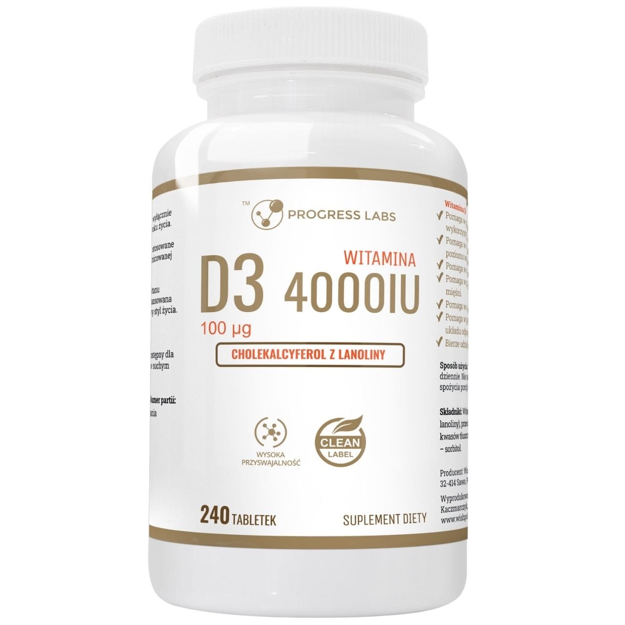Progress Labs Vitamine D3 4000 IE is een voedingssupplement in tabletvorm dat 100 µg ( 4000 IE , 2000% ADH ) cholecalciferol uit lanoline bevat. Vitamine D draagt bij tot het behoud van normale botten en tanden , een normale opname van calcium en fosfor , een normaal calciumgehalte in het bloed , een normale werking van het immuunsysteem en een normale spierfunctie. Tabletten zijn glutenvrij , sojavrij , lactosevrij en GMO-vrij. Verpakking van 240 tabletten.
