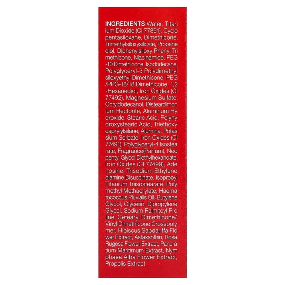 Water, titaandioxide (ci 77891), cyclopentasiloxaan, dimethicone, trimethylsiloxysilicaat, propaandiol, difenylsiloxy fenyl trimethicone, niacinamide, peg -10 dimethicone, isododecaan, polyglyceryl-3 polydimethylsiloxyethyl dimethicone, peg /ppg-18/18 dimethicone,1,2 -hexanediol, ijzeroxiden (ci 77492), magnesiumsulfaat, octyldodecanol, disteardimoniumhectoriet, aluminiumhydroxide, stearinezuur, polyhydroxystearinezuur, triethoxycaprylylsilaan, aluminiumoxide, kaliumsorbaat, ijzeroxiden (ci 77491), polyglyceryl-4 isostearaat, geurstof (parfum), neopentylglycoldiethylhexanoaat, ijzeroxiden (ci 77499), adenosine, trinatriumethyleen diamine disuccinaat, isopropyl titanium triisostearaat, polymethylmethacrylaat, haematococcus pluvialis olie, butyleenglycol, glycerine, dipropyleenglycol, natrium palmitoyl pro line, cetearyldimethicone/vinyldimethicone crosspolymeer, hibiscus sabdariffa bloemextract, astaxanthine, rosa rugosa bloemextract, pancra tium maritimum extract, nymphaea alba bloemextract, propolis extract.
