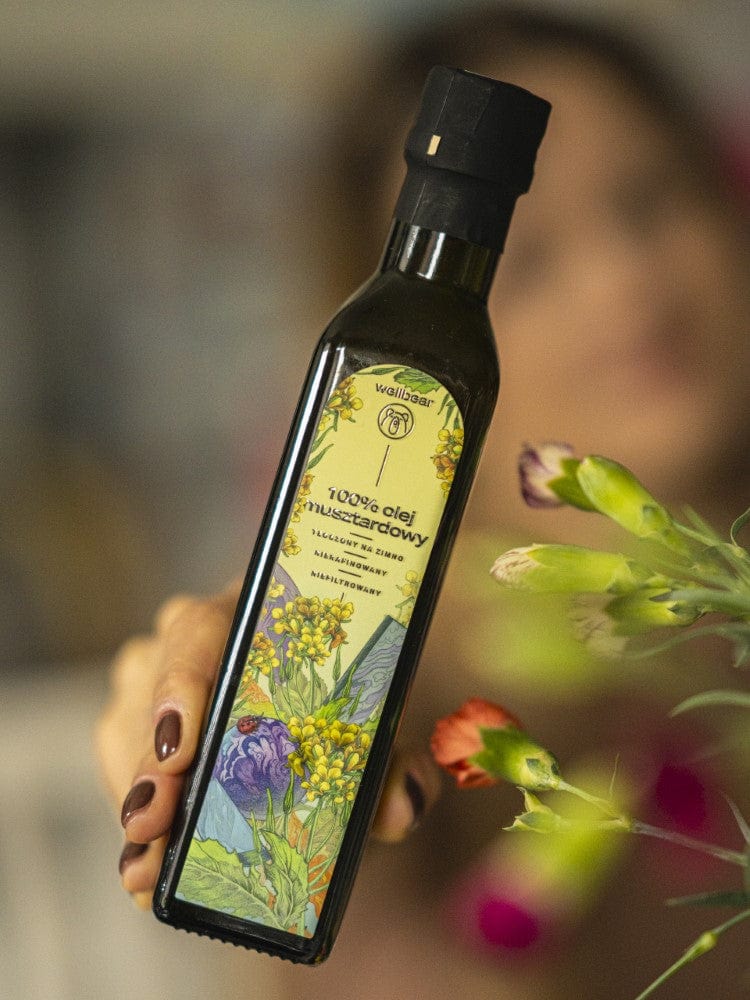 Mosterdolie Koudgeperst is een olie die wordt gewonnen uit zorgvuldig geselecteerde mosterdzaden. Het product bevat alle natuurlijke ingrediënten die in de zaden van de plant zitten. Tegelijkertijd, is het vrij van conserveringsmiddelen, kleurstoffen of kunstmatige antioxidanten. Het product wordt niet gefilterd of gezuiverd, waardoor het veel stoffen bevat die waardevol zijn voor de gezondheid.
